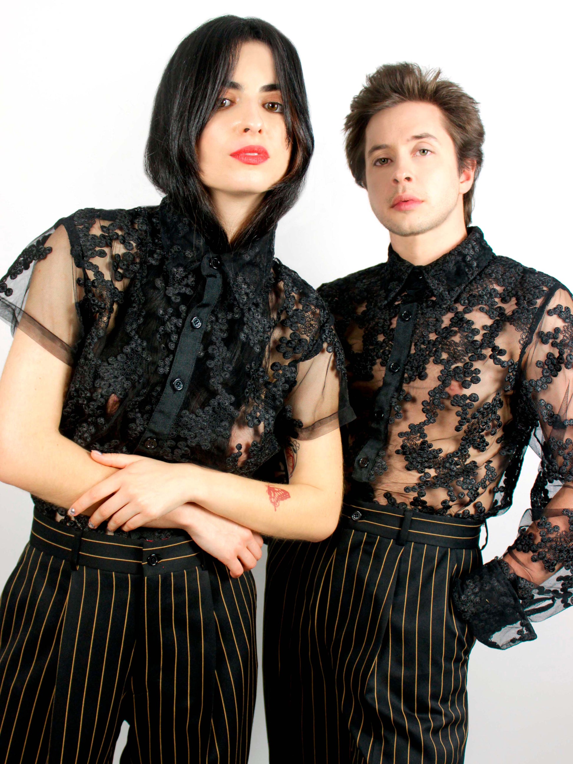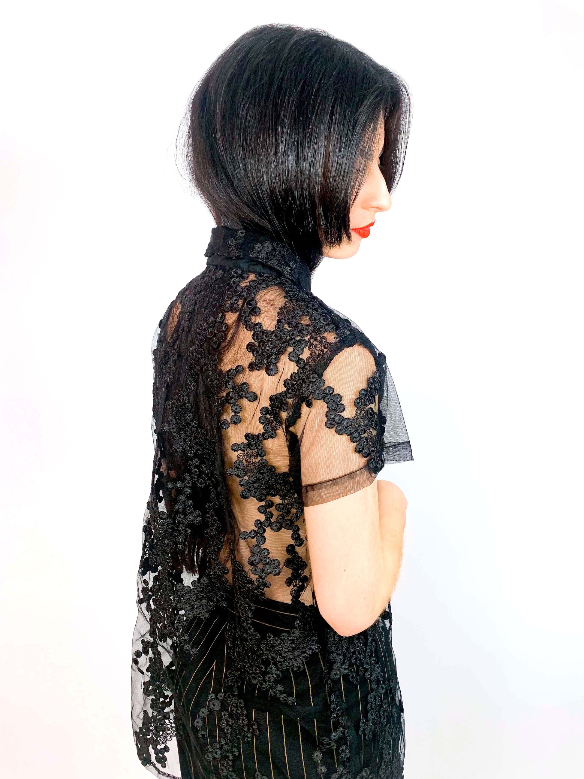 | Unisex shirt with black base fabric, embroidered with circular motifs in black.This shirt features a pointed collar and short sleeves. Relaxed shape.Handmade piece. |