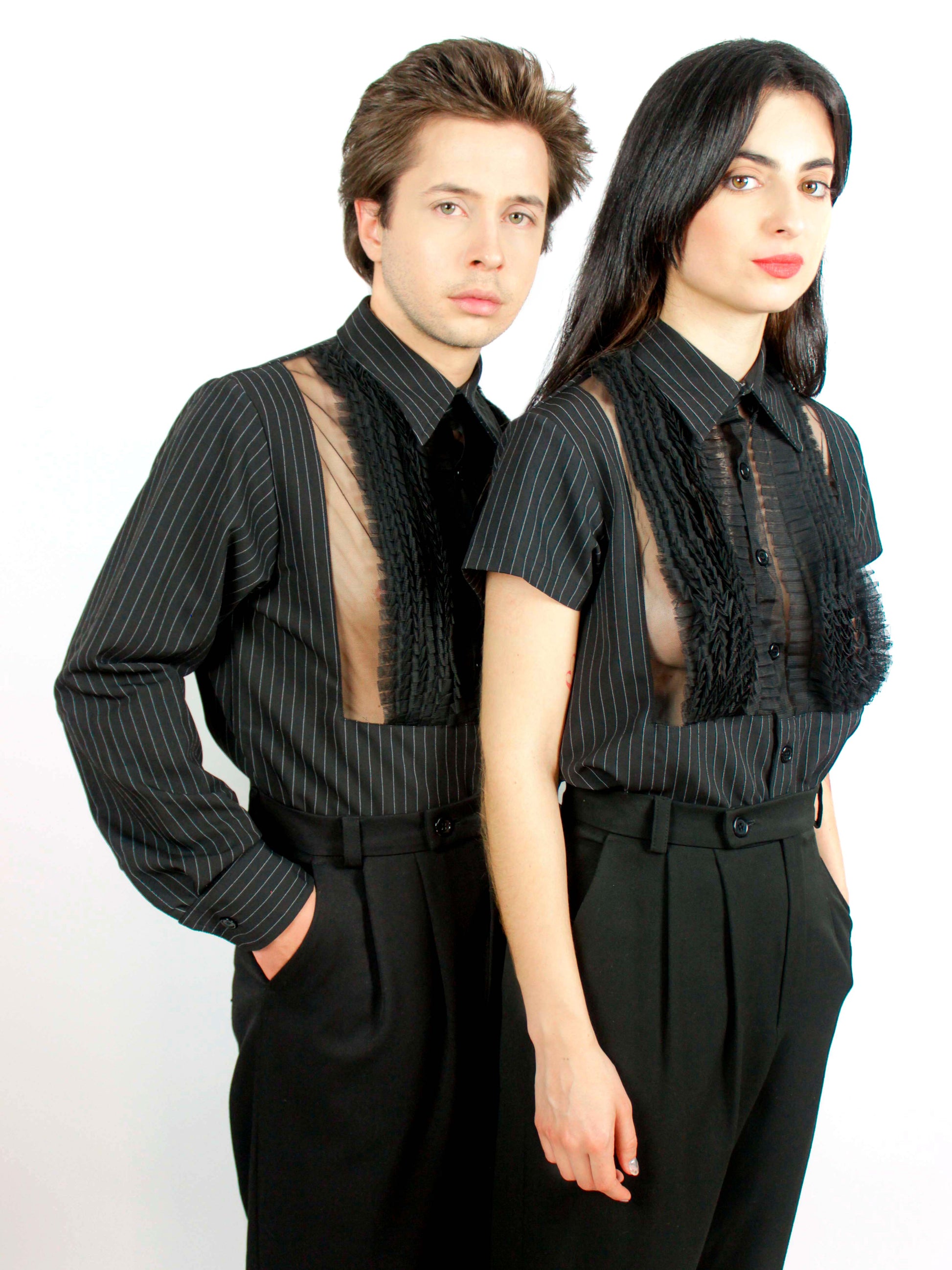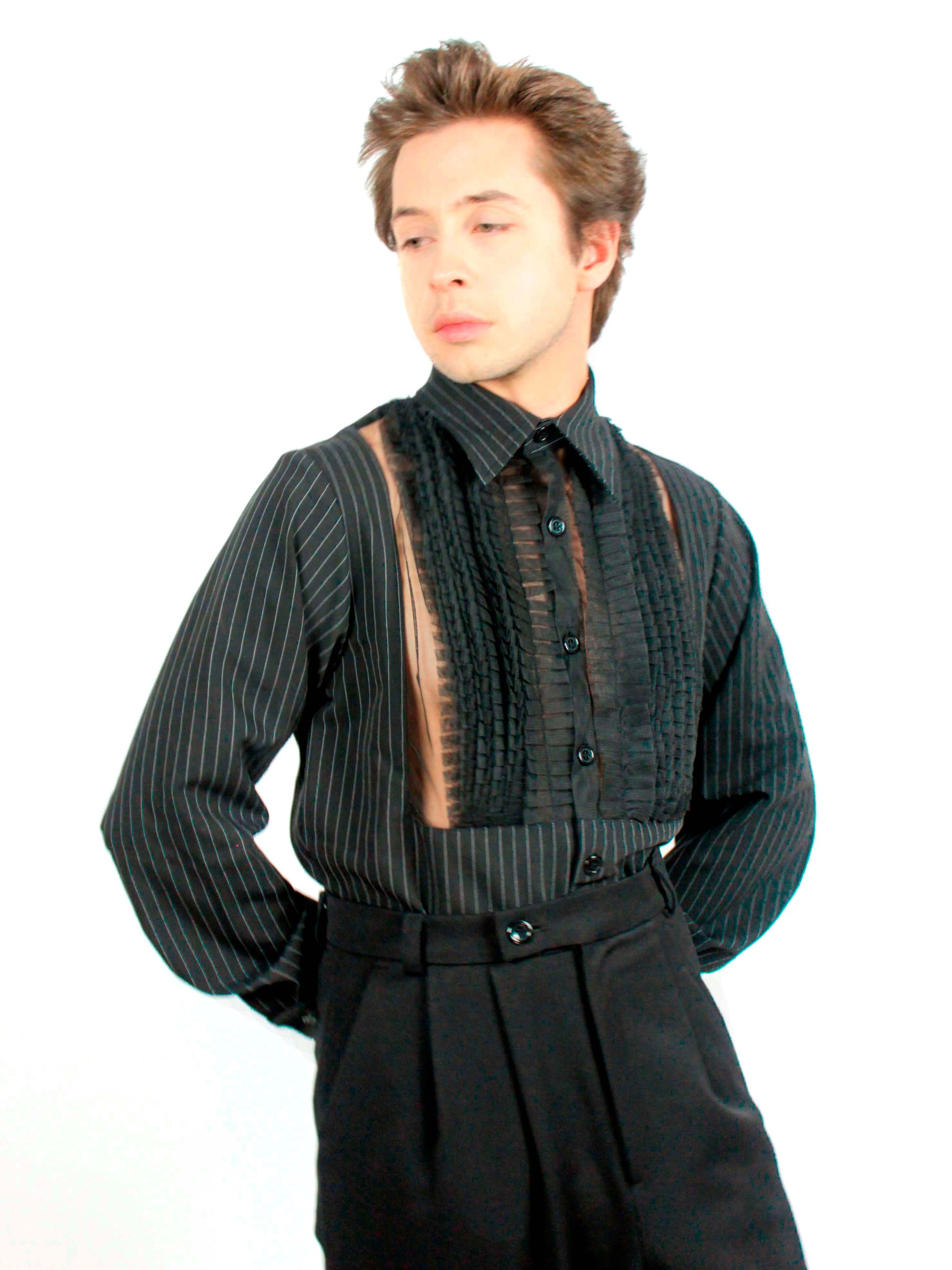 | Unisex shirt in black chalk stripe fabric with frill front panel. This shirt features a pointed collar and long sleeves. Relaxed shape. Handmade piece. |