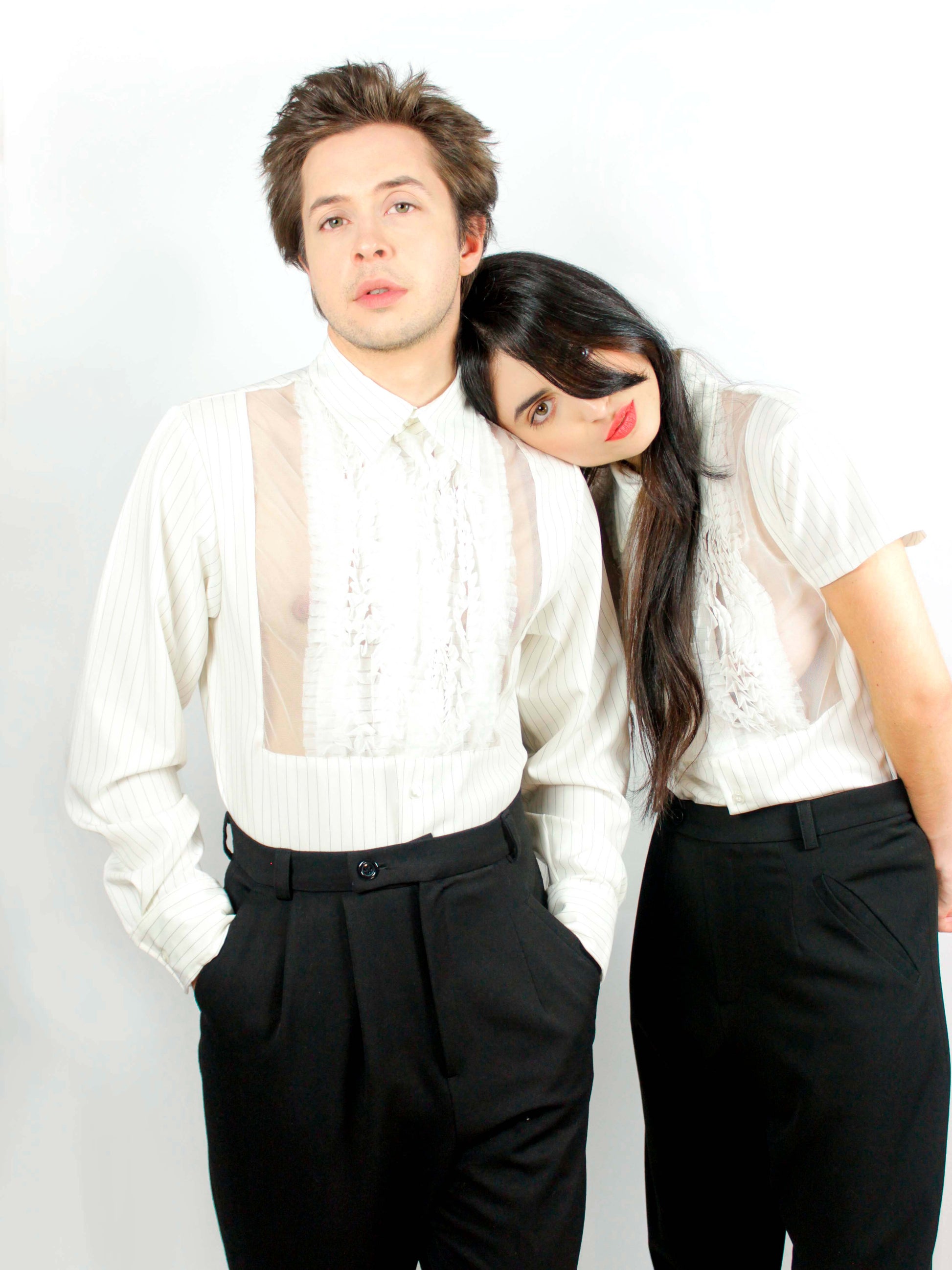 | Unisex shirt in white chalk stripe fabric with frill front panel. This shirt features a pointed collar and short sleeves. Relaxed shape. Handmade piece. |