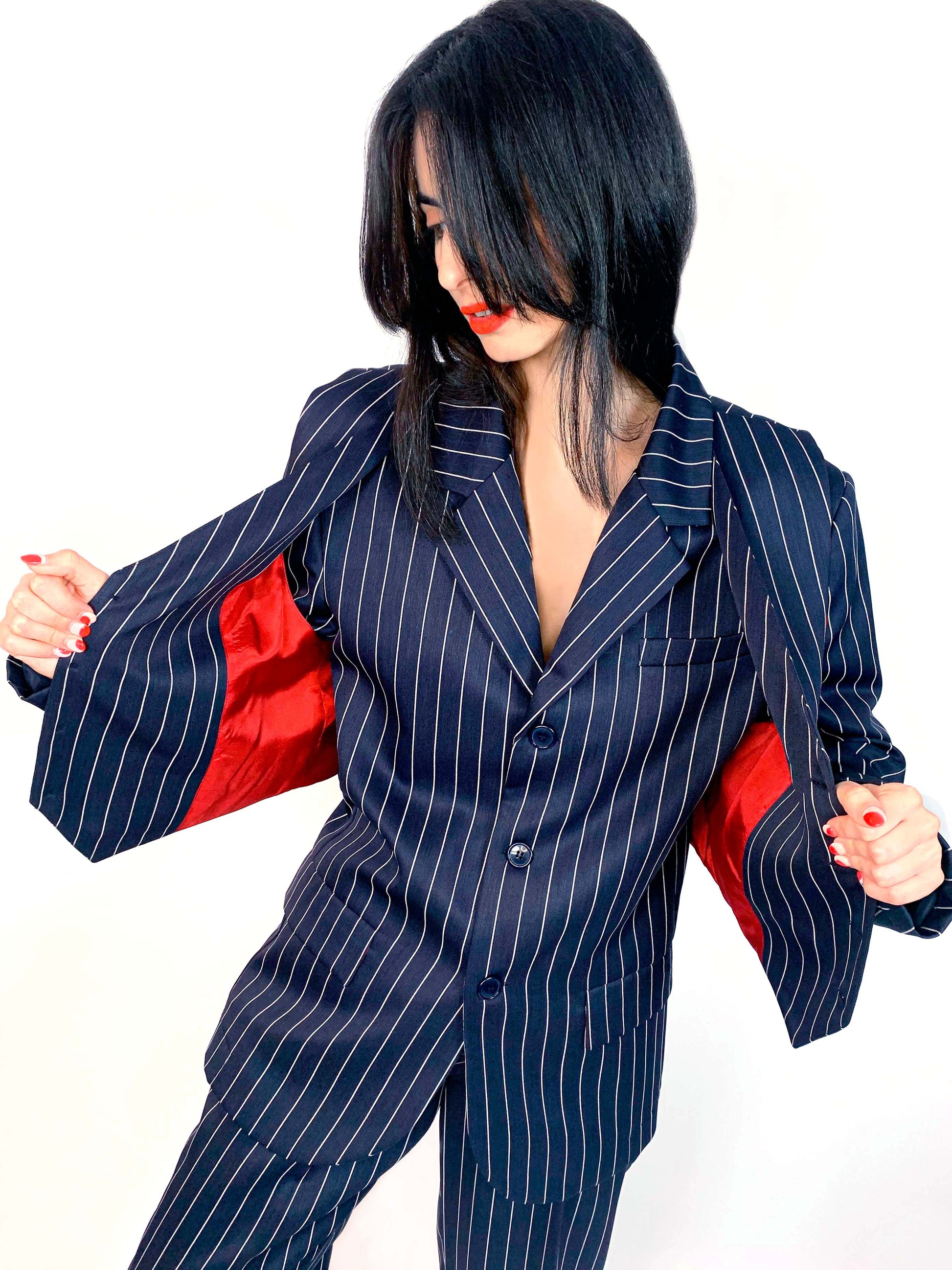 | Unisex Blazer with waistcoat overlay, model inspired by classic tailoring in dark blue fabric with chalk stripe in white. Blazer composed of classic lapels, front button closure, front pockets with flap, a chest pocket and long sleeves that can be adjusted to any height through an adjustment system on the inside of the sleeve. The waistcoat comprises two front pockets and a front button fastening with a fastening system at the back for silhouette adjustment. The attachment of the waistcoat to the blazer is made through a button on the back that allows the possibility of separation. Handmade piece. |