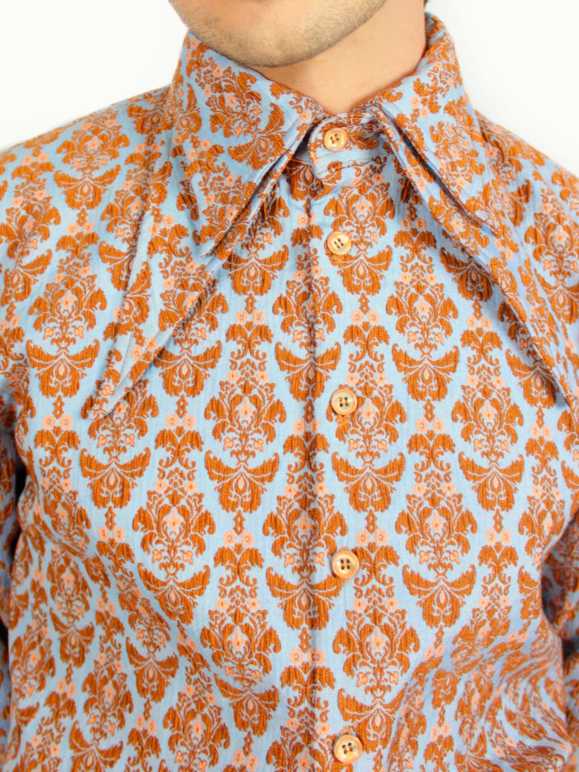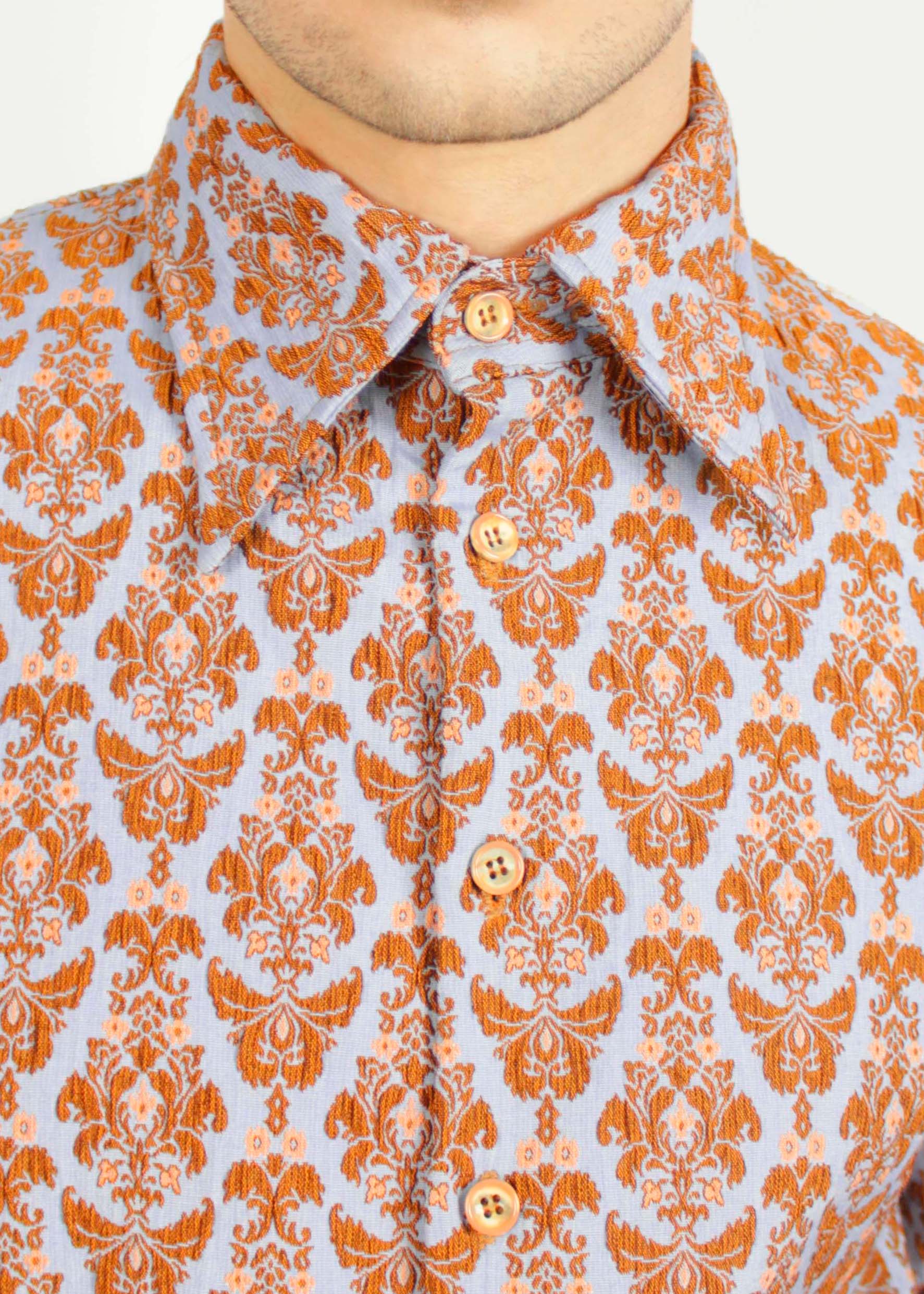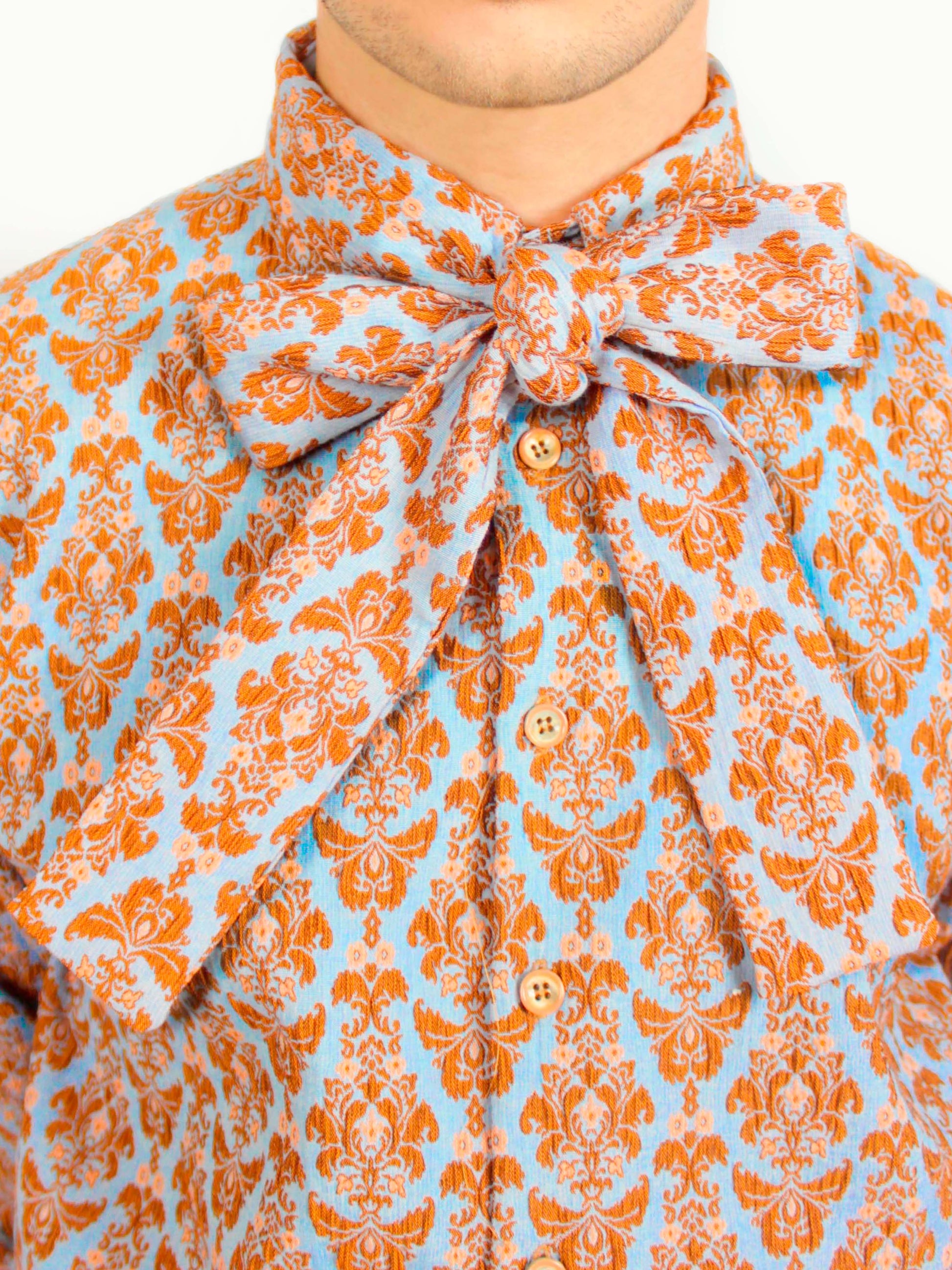 | Unisex brocade shirt in baby blue and caramel brown. This shirt features three collars, so you can have multiple options for changing collars. Shirt in short sleeve. Relaxed shape. Handmade piece. |
