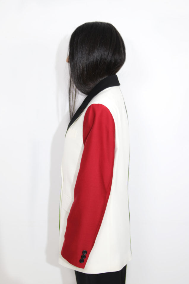 | Tricolor blazer unisex with notched lapels, front button closure, long sleeves, straight sheath and pockets inlaid with lapel. Handmade piece. |